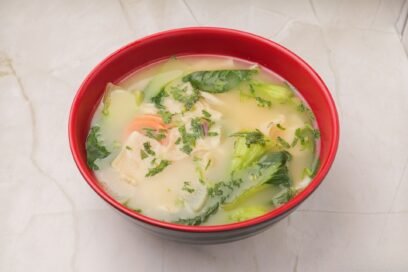Traditional Tibetan-style hand-pulled noodle soup. Flat, chewy bite-sized dough pieces simmered in a robust and flavorful broth with seasonal veggies and aromatic spices. Hearty and deeply satisfying.